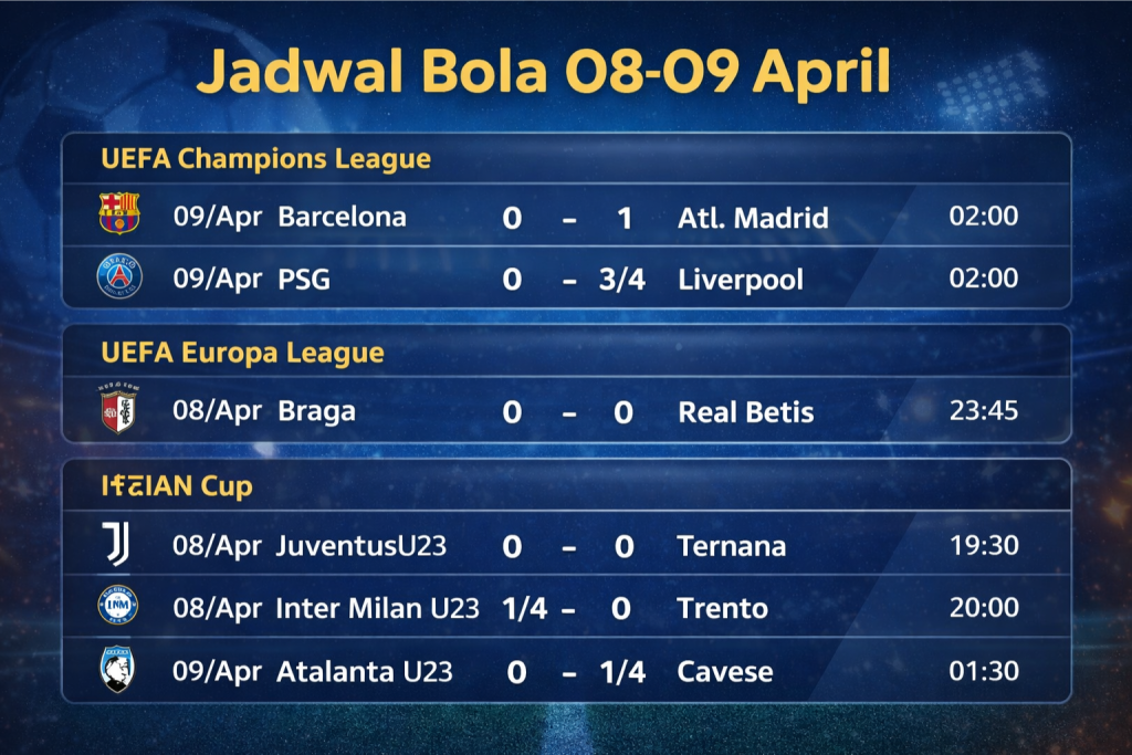 Jadwal Bola Hari Ini 08 – 09 April 2026: Liga Champions, Liga Europa, dan Italian Cup U23