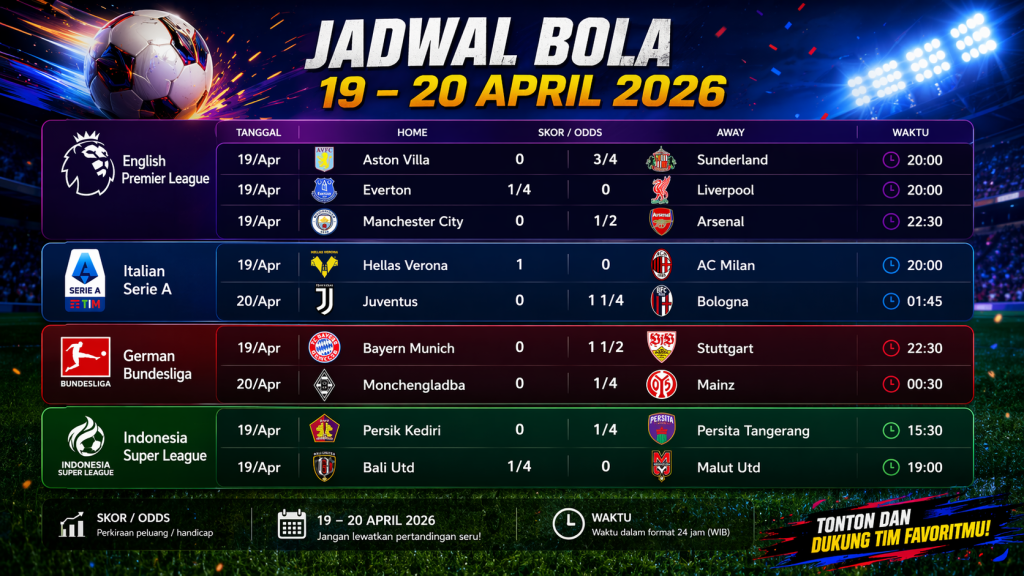 Jadwal Bola Hari Ini 19–20 April 2026: Laga Seru dari Premier League hingga Liga Indonesia