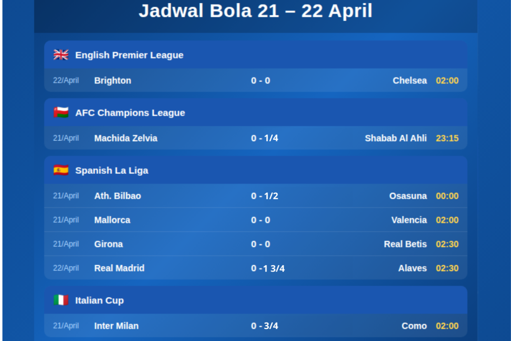 Jadwal Bola Hari Ini 21–22 April 2026: Liga Top Eropa & Asia Siap Menghibur
