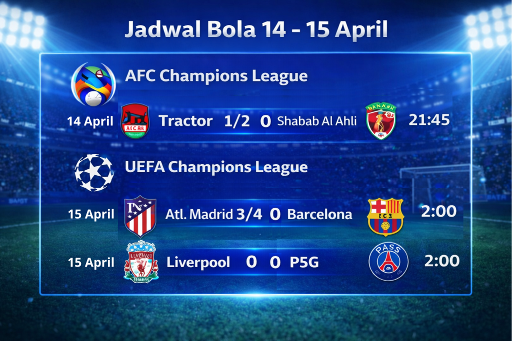Secara keseluruhan, jadwal bola pada tanggal 14–15 April 2026 menghadirkan pertandingan-pertandingan yang sangat menarik dari dua kompetisi besar dunia. Mulai dari duel di AFC Champions League hingga laga panas di UEFA Champions League, semuanya menawarkan hiburan berkualitas tinggi bagi para penggemar sepak bola.