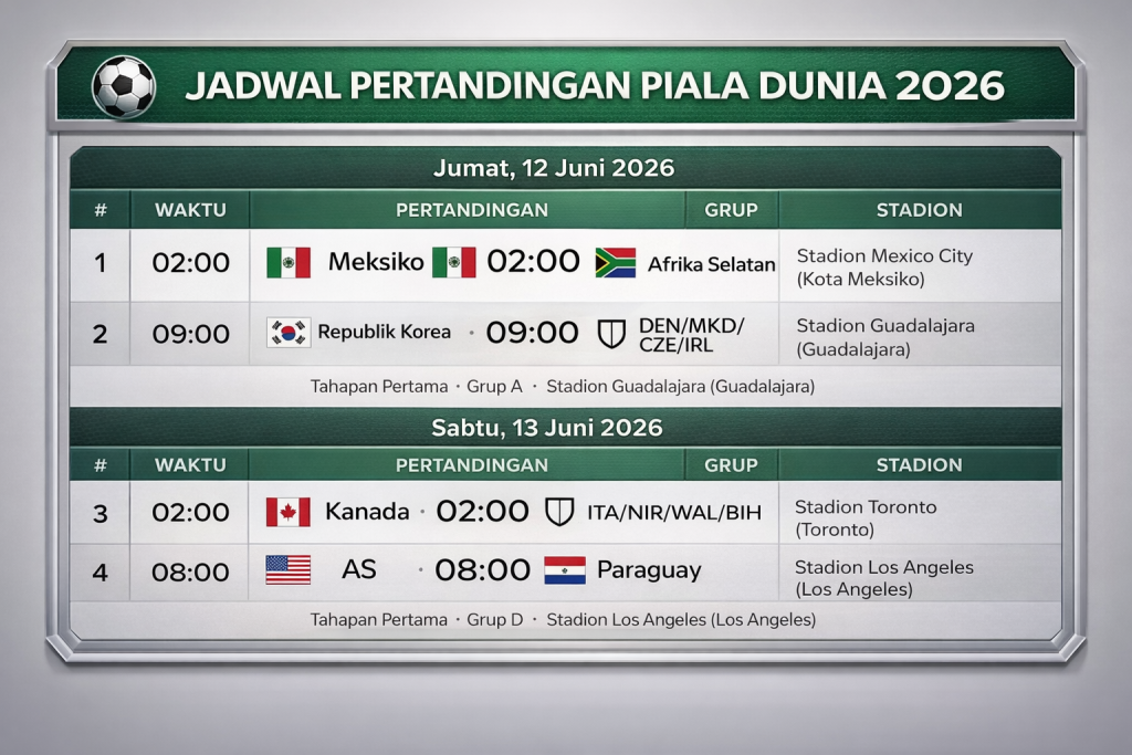 Piala Dunia 2026 akan menjadi edisi terbesar dalam sejarah sepak bola. Untuk pertama kalinya, 48 tim akan bertanding di tiga negara tuan rumah: Amerika Serikat, Kanada, dan Meksiko. Bagi Anda penggemar sepak bola di Indonesia, memantau jadwal Piala Dunia 2026 adalah hal wajib agar tidak ketinggalan aksi bintang dunia.