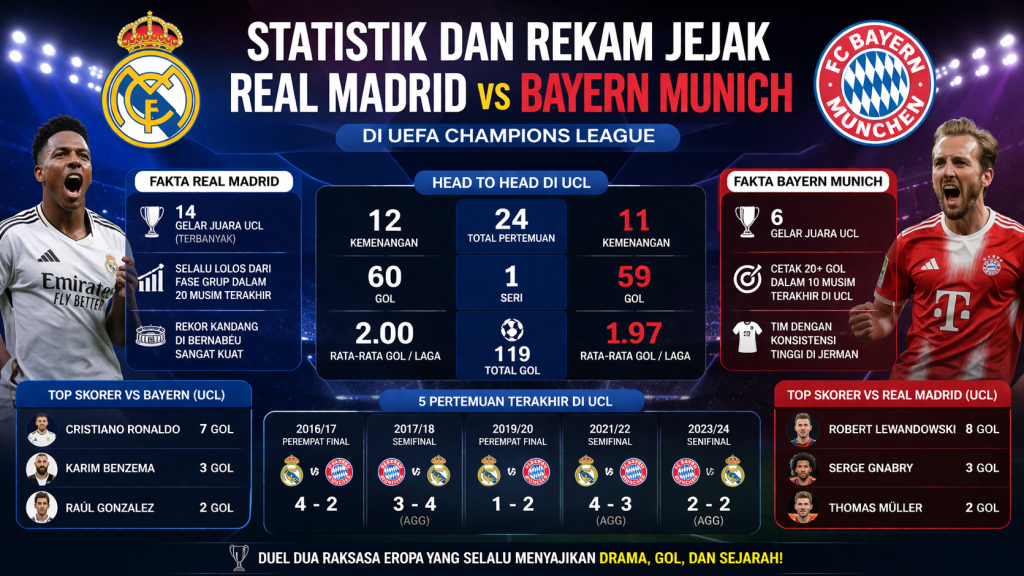 Pertandingan antara Real Madrid dan Bayern Munich selalu menghadirkan drama, tensi tinggi, dan kualitas sepak bola kelas dunia. Dalam sejarah UEFA Champions League, kedua tim ini telah berulang kali bertemu dalam laga-laga krusial. Setiap pertemuan mereka bukan sekadar pertandingan, melainkan pertarungan dua raksasa yang sarat gengsi dan ambisi.